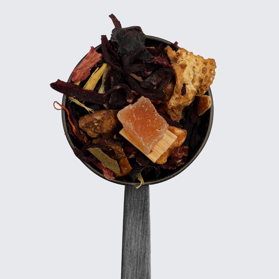 Hibiscus, pineapple, papaya, raisins, rose hips, apples, orange, lemongrass, licorice, ashwagandha, ginger, orange mango extract, marigold, safflower.